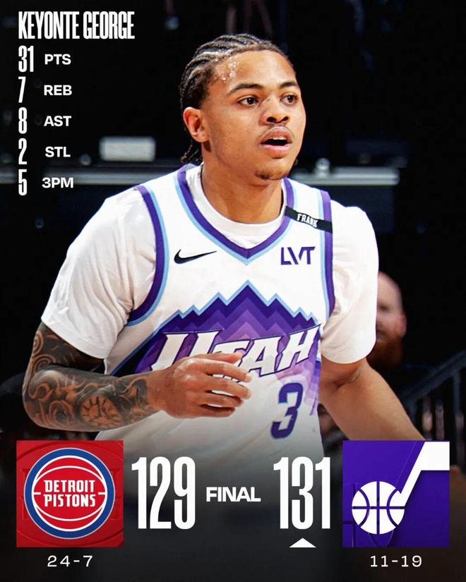 常规赛,爵士主场131-129击败活塞。本场比赛,爵士后卫基安特·乔治再次表现出色:出战35分钟,22投12中,三分球10中5,罚球2中2,得到31分7篮板8助攻2抢断,正负值+10。爵士队赢得这场比赛并不容易。第二节他们落后10分。乔治本节7投5中,得到13分。半场结束,他得到20分和4次助攻。关键的第四节,乔治拿下4分5篮板2助攻。要点不多,但都是在最关键的时刻。最后一分钟的剧情尤为疯狂:——还剩1分14秒,乔治抢断勒韦尔轻松扣篮,比分129-125——还剩1分04秒,坎宁安突然扣篮得手,活塞只差2分——还剩18秒,坎宁抢断。程努吉犯规,上篮命中我罚球。两队战成129平——比赛还剩2秒,乔治上场投篮绝杀活塞。不得不说,这并不是乔治近段时间第一次发挥出色。过去7场比赛,乔治得分20+,其中4场比赛得分30+。在此期间,他场均得到30.3分5.1篮板7.1助攻,三分命中率分别为50.0%/46.7%/91.5%。放大整个赛季,乔治一共出战30场比赛,场均贡献24.1分4.2篮板6.8助攻。他的三分命中率为45.3%/36.9%/90.8%,真实投篮命中率为61.0%。他的得分可能排在联盟第19位。相比之下,乔治过去两个赛季:——2023-24赛季,场均贡献13.0分2.8篮板4.4助攻,三分命中率39.1%/33.4%/84.8%,真实投篮命中率为53.3%——场均命中率50.3%的赛季,2624次。场均 3.8 个篮板和 5.6 次助攻我,投篮命中率为百分之三。投篮命中率为39.1%/34.3%/81.8%,真实投篮命中率为53.9%。基安特·乔治 (Keyante George) 是 2023 届首轮第 16 顺位新秀。他身高1.93米,司职后卫。他进攻技术出色,擅长利用挡拆来发起进攻。他在对抗中具有良好的节奏感和身体能力,可以在三分线和中距离完成得分。爵士队在选择他的时候,就表示希望组建一支以他为主力的球队。不过毕竟他在kanythe赛事前两个赛季的表现并不是特别完美。他的进攻无效,防守和组织也不可靠。但本赛季,乔治的表现确实不一样了。他的球使用率从去年的23.7%上升到27.2%。他的效率不但没有下降,反而还提升了两个层次。目前,他的得分、篮板、助攻均创职业生涯新高s。进步完全有望争夺本赛季进步最快球员称号。关键是,乔治虽然才三年级,但关键时刻确实可靠。除了本场比赛输给活塞队之外,他在本赛季早些时候还用三分球击败了公牛队。没过多久,对阵魔术队的就是乔治了。加时赛还剩4秒时打成3+1,帮助爵士队领先1分。对于同伴来说幸运的是,他最终还是输了。贝恩的压哨球。本赛季至今,乔治在关键时刻(最后5分钟得分在5分以内)的表现:一共出战14场,总共得到62分,三分球命中率为45.2%/38.5%/90.6%。爵士队在这14场比赛中赢了8场——整个赛季爵士队只赢了11场比赛,这当然不算多,但赢得这么多比赛,乔治功不可没。赛后,在谈到压哨绝杀时,乔治说道:“我整个夏天都在努力训练,只是为了那一刻乔治说的没错,乔治在休赛期付出了很多努力,如果没有,就看他的三分球和罚球,如果没有刻苦训练,短时间内很难有明显的提高。当然,乔治还有很多不足,比如体能需要提高(12月初对阵火箭的比赛中他得到0分和8次失误),进攻选择还可以继续优化,防守贡献有限。但别忘了,这只是乔治的第三个赛季,他目前只有22岁,如果按照乔治的表现,他甚至可能会入选全明星(全明星总是喜欢年轻球员),乔治在休赛期有资格续约,即使他不签顶薪,那又怎样呢?困扰他的是一份大而昂贵的合同。年轻球员的成长总是让人惊叹,乔治就是一个很好的例子。本赛季之前,他给人的印象是一个有潜力的年轻人,但并不了解,他的成长似乎还很遥远。本赛季,乔治表现完美,甚至在关键时刻取代马尔卡宁成为球队的第一选择。可以说他最近的表现非常亮眼,希望能够保持下去。