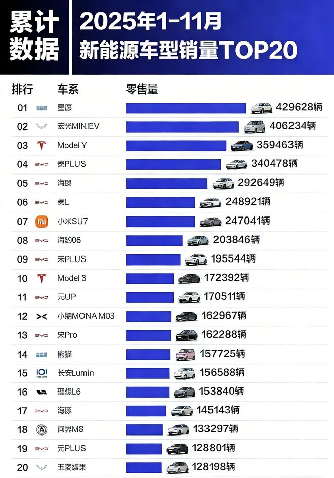 2025年即将结束,各车型销量基本确定。中国乘联会公布的零售数据显示,1-11月新能源汽车销量前20名也已出炉。从榜单来看,1-11月新能源汽车销量前20名通常以国产品牌为主。其中,吉利星源表现出色,特斯拉Model Y继续表现强劲。 1-11月,吉利星源累计销售429,628辆,成为最畅销新能源车型。其68800元起售价相当实惠,加上2650mm的超长轴距,满足大多数家庭的日常出行需求。五菱宏光MINIEV以406,234辆位居第二。其3万多元的起售价相当实惠,让很多年轻人能够以低廉的价格拥有汽车。特斯拉 Model Y 排名第三,销量为 359,463 辆。尽管纯电动中型车竞争激烈SUV市场,特斯拉Model Y凭借强大的品牌认知度和产品力,依然保持领先地位。第四位是比亚迪秦PLUS,销量为340,478辆。它是榜单上排名最高的新能源A级家用轿车。它的起售价仅为6.98万元,也算实惠。比亚迪海鸥以292,649辆排名第五。在吉利星源推出之前,海鸥是最畅销的小型纯电动车型。但随着吉利星源的上市,海鸥的销量被超越。小米SU7排名第七,累计销量247041台。理想L6、文杰M8等车型也榜上有名,分别排在第16位和第18位,等效销量分别为153,840辆和133,297辆。从榜单总体分析不难看出,起售价10万元及以下的车型更受欢迎。 1-11月销量前20名中,起售价有13款10万元以下的车型,占比65%,而起价20万元以上的车型仅有5款,占比仅25%。国泰海通发布研报称,11月新能源汽车产量188万辆,同比增长20%; 1-11月新能源汽车累计产量1490.7万辆,同比增长31.4%。受年末尾部效应影响,新能源汽车销量将进一步增长。本文来自:金融行业汽车 作者:刘航