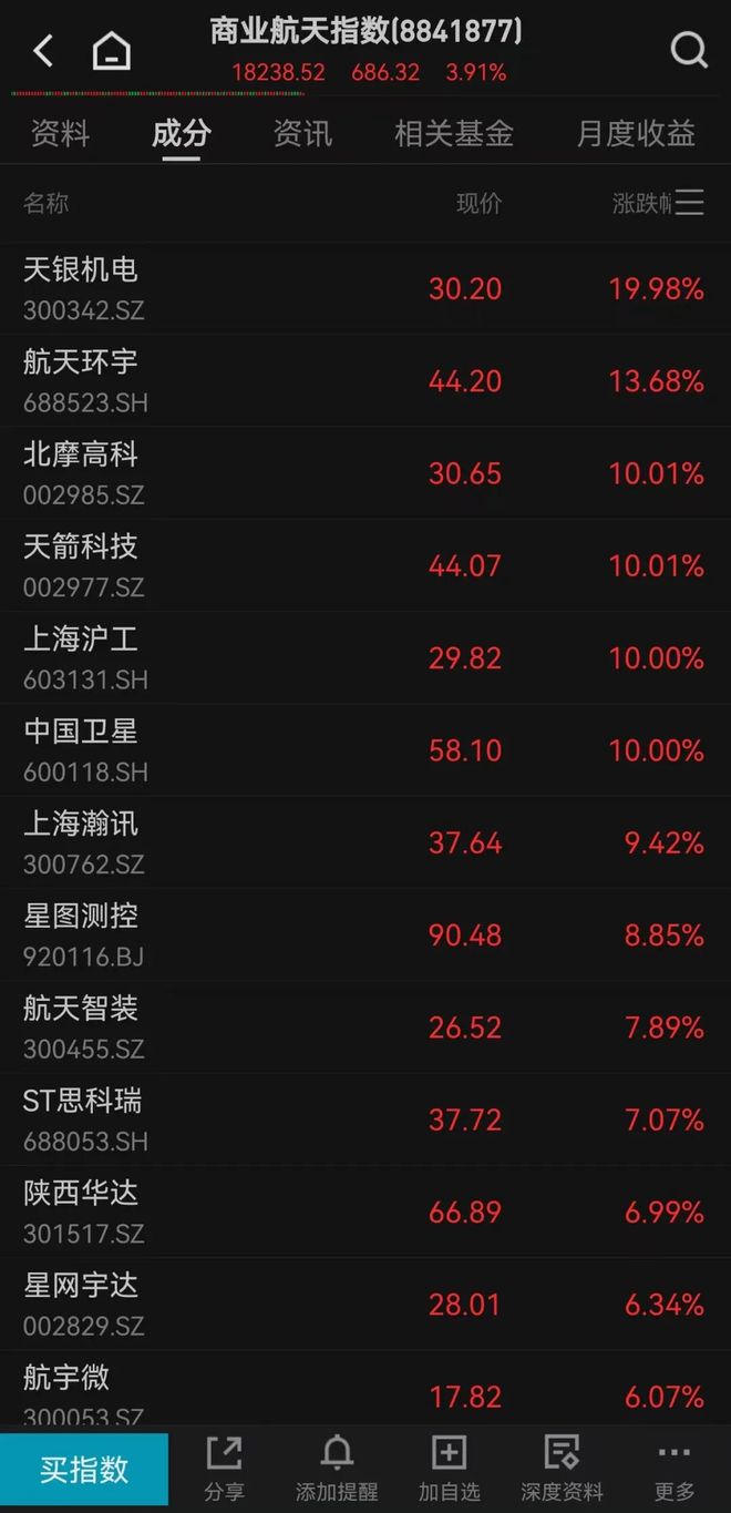如今,商业航空航天股已处于每日趋势极限。早盘,天银机电涨停20cm。航天环宇涨逾13%。北漠高科、火箭科技、上海沪工、中国卫星等都长了10厘米。 但午后小幅下跌,天银机电、上海沪工、中国卫星等齐齐开盘,商航指数从上涨4.5%左右直接回落,收于2.6%。商业航天发展的背后,一是政策支持,商业航天部成立,“十五五”规划明确提出发展航天强国;二是密集融资和首次商业航天飞行,持续提升市场预期;第三,美国SpaceX即将上市,估值预计将达到1.5万亿美元。美元,这是巨大的。刺激了投资潜力A股市场及合作伙伴的情况;第四是空间之战。从国家安全角度看,太空已成为继陆、海、空、网络之后的第五战略领域。商业航天拥有独立、可靠、快速响应的能力,意味着通信、导航、行为监控等可能不再受制于人。到2025年,朱雀三号、天龙三号、重力二号、双曲三号、帕拉斯一号等多种新型商用火箭将按计划发射;中国版“星链”计划千帆星座、GW星座等将持续推出;海南商业航天发射场进入正常发射阶段,二期工程正在进行中。 从行业角度来看,中国民营商业航天企业有望掀起上市热潮。目前,星际荣耀、天兵科技、银河动力等商业航天公司r、宜新航天已进入IPO辅导期。此外,资金雄厚,前景广阔。例如,蓝箭航天已完成17轮融资,明星股东众多,包括红杉资本、经纬中国、建银国际、国家制造业转型升级基金、一村资本、华创资本等。尤其是SpaceX,此前曾报道称该公司拟融资超过300亿美元。按本次募资规模计算,公司估值将达到约1.5万亿美元。第 3 页。教查称,如果该计划成功实施,这将是历史上最大的上市交易。它不仅将改变全球航空航天业的资本结构,还将这家科技巨头前所未有的目标推向公开市场。 SpaceX概念股上涨,西部材料涨停。大家可以关注一下这一波。 商业的航空航天产业链分为上下游。华泰白锐对此总结得很好,我们来看看。上行链路主要是发射和传输。主要价值在于提供低成本、高可靠、高频的“太空运输能力”。主要参与者包括 SpaceX 目前的猎鹰 9 号、中国的朱雀三号和其他可回收火箭。 中游环节主要是卫星制造和星座运营。主要价值在于开发低成本、高性能、批量化的卫星平台和高效稳定的星座运营网络。下游环节主要是应用和数据服务。核心价值在于将数据/能力空间转化为各行业客户可以用来解决实际问题的产品和服务。也是整个产业链中价值更大、潜力更广的一环。以下为股票配资清单cept statistics from Guohai Securities: